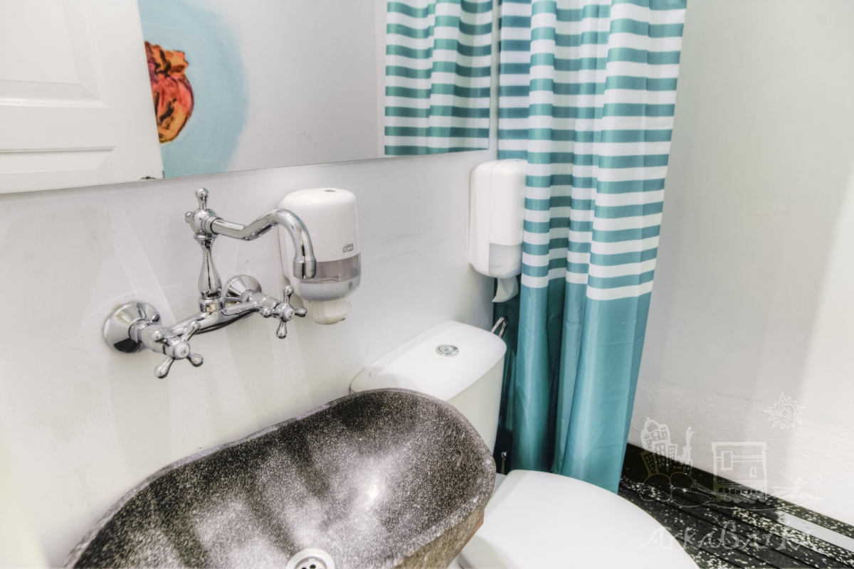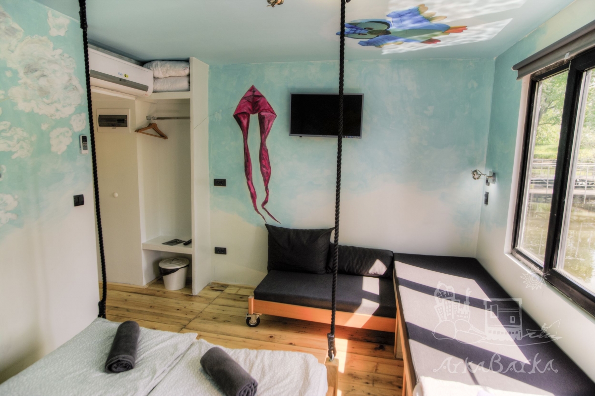 ARKABARKA 2 – ROOM WITH HAND PAINTED WALLS AND DESIGNED BATHROOM. SIZE IS 30 M2 WITH AIR-CONDITION, SMART TV AND HAS 1X DOUBLE BED, 3X SOFA BED, WARDROBE/CLOSET.